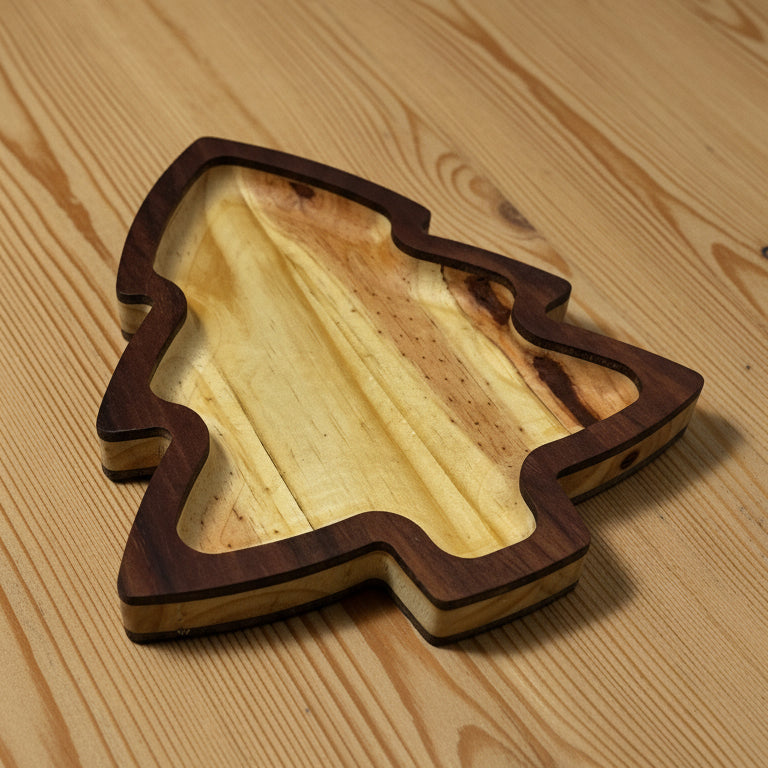 Regala momentos especiales con este platito en forma de pino, elaborado con una combinación de maderas de pino y okume de 20 x 17 cm, que resaltan su contraste natural y su acabado artesanal.